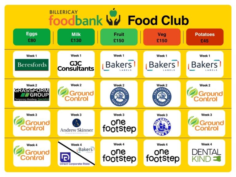We’ve launched our Billericay Foodbank Food Club, where we’re supported by generous coprorate friends to provide fresh, healthy food on a regular basis. Local businesses are providing regular monetary donations on a weekly to monthly basis to ensure we can provide critical, fresh provisions in our food parcels.